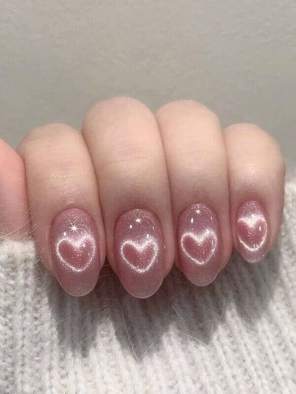 A romantic nail art with hearts and glitters is all that Valentine’s dreams are made of, isn’t it? Kant says, “The Heartbeat Effect in cat-eye nail art is a mesmerising Valentine’s Day trend that creates a glowing, pulsating shimmer resembling a heartbeat monitor or a soft, radiant heart shape. It’s achieved using magnetic gel polish and a specialised magnet to manipulate the metallic pigments.”