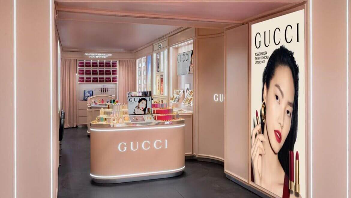 The newly opened Gucci Beauty boutique reflects the brand’s distinctive design language and aesthetics. With a thoughtfully curated interior featuring soft pink furniture contrasted by sleek black flooring, the space exudes both opulence and warmth. Refined makeup counters offer an approachable luxury, making the store an inviting destination for beauty enthusiasts.