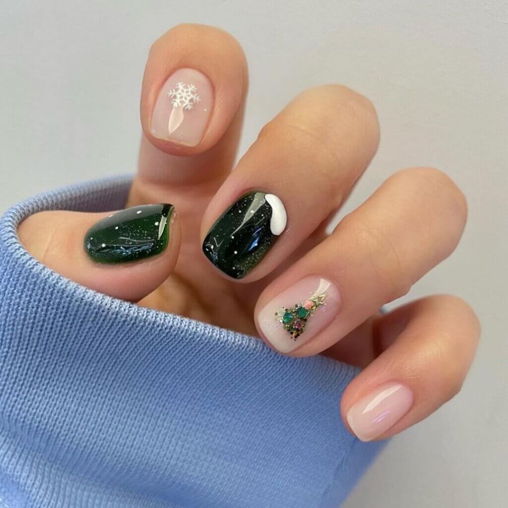Nail art aficionados are incorporating iconic holiday symbols into their designs, with miniature snowflakes, reindeer, and snowmen gracing nails in intricate detail. Some are even opting for 3D embellishments like tiny bows or miniature ornaments for an extra festive flair.