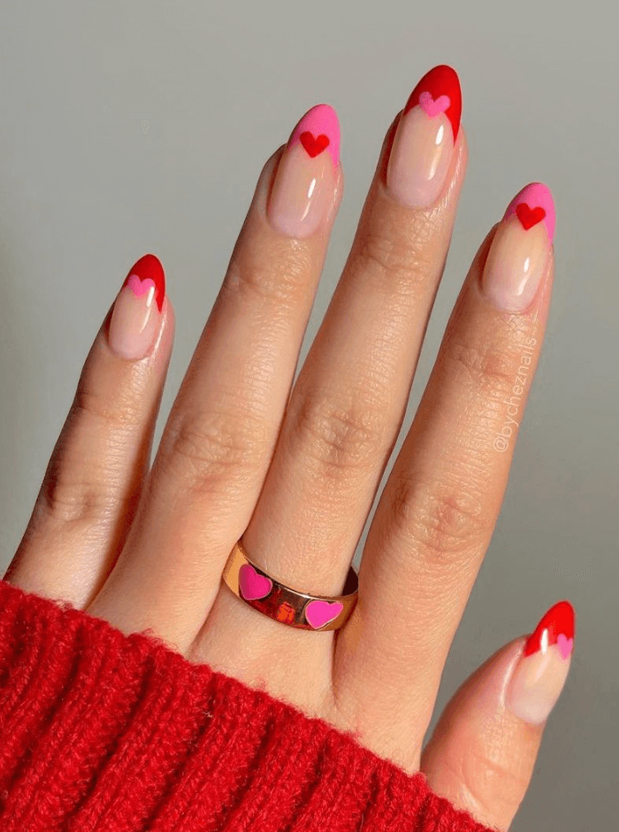 This look blends a soft nude base into vibrant red tips, enhanced with minimal heart detailing. The gradient technique keeps the design current, while the red injects timeless Valentine appeal. It is a suitable choice for clients seeking festive nails that remain fashion-forward rather than overly thematic.